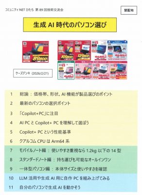 今回は、「生成AI時代のパソコン選び」について、石井さんに紹介頂きました。Windows10のサポート終了でパソコンの買い替えを検討されている方や、生成AI時代に相応しいパソコンは何かを検討されている方が居られます。今回は、最新のパソコン選びのポイント、話題のAIPCとCopilot+PCについて、モバイルノートやスタンダードモデルなどのカテゴリー別のパソコン選びのポイントなどについて、注目機種の動向など実例を交えて紹介して頂きました。