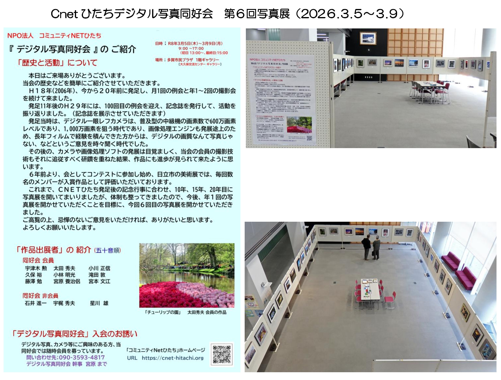 デジタル写真同好会 第6回写真展を2026年3月5日(木)~9日(月)多賀市民プラザ1階ギャラリーにて開催しました。展示期間中は1日約30~70人の来場者があり 来場者数は最終的には244人で、写真の内容がすばらしいと評判も上々でした。ここでは展示会場の様子、展示した写真作品を掲載しています。